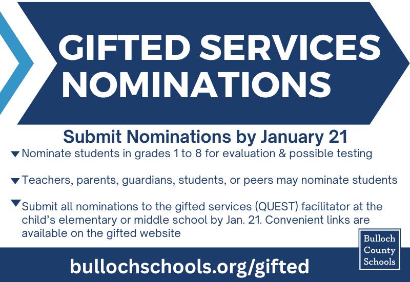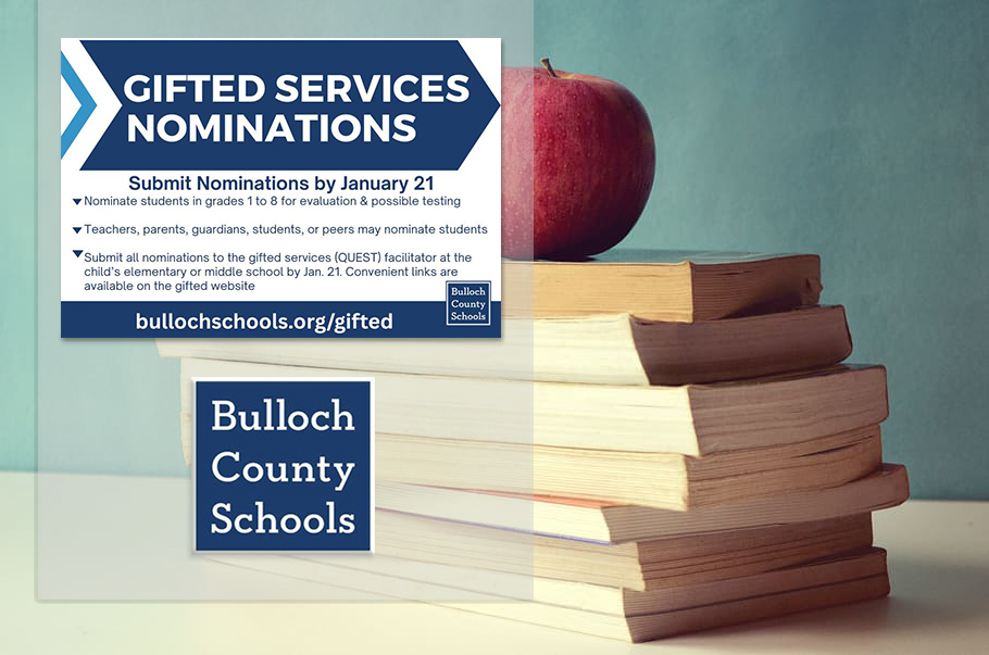 Bulloch County Schools’ spring nomination window for Gifted Services is open now through January 21.