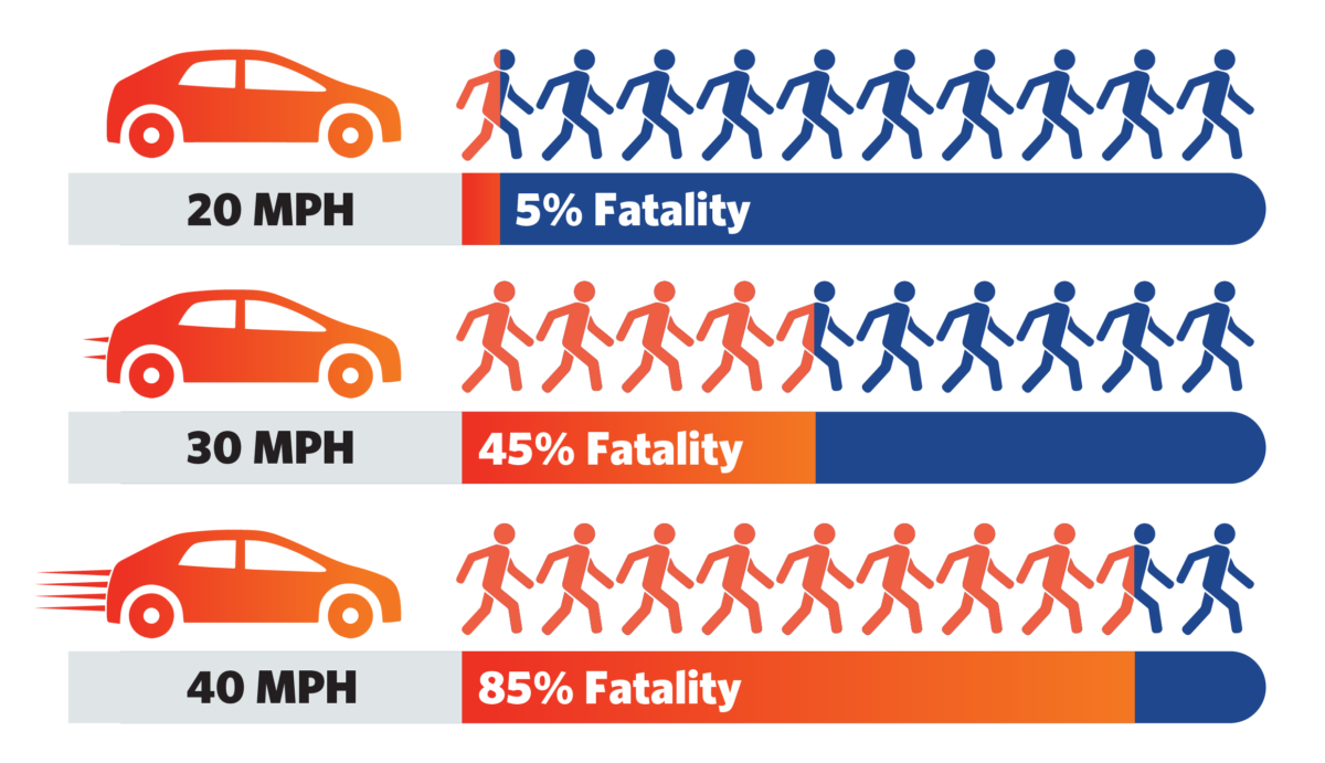 - When a pedestrian is struck by a vehicle traveling 40 MPH, 9 out of 10 of those pedestrians will die.