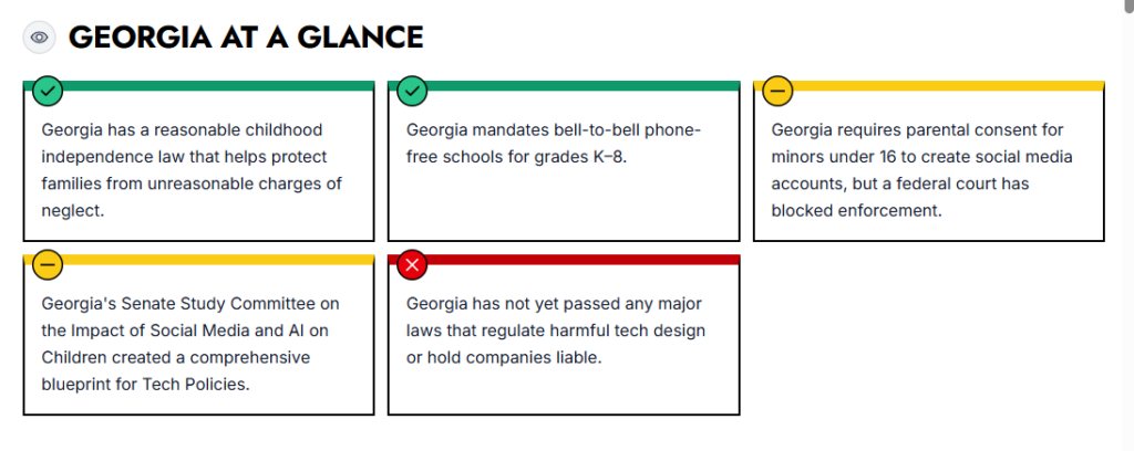 “Kids deserve a childhood filled with friendships, play, and real-world experiences, not one dominated by addictive technology,” said Sen. Harrell. “Georgia’s recognition as a Rising Star shows we’re beginning to take the responsibility seriously to protect children online and give families more control. When the federal government fails to act, states must step into the breach. This recognition shows that Georgia can be a leader in protecting kids online. When we make technology safer by design, we give children the space they need to grow, learn and thrive.”