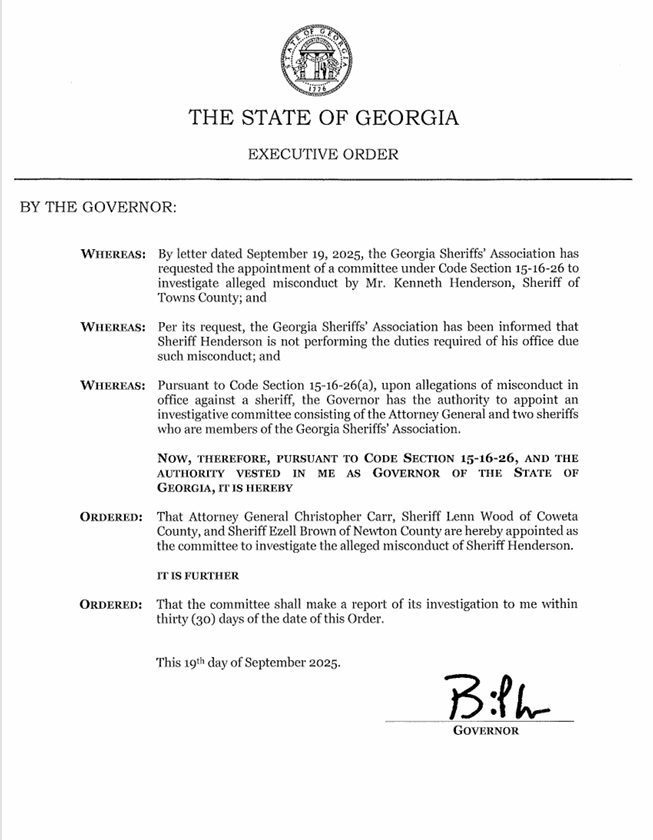 Governor Brian Kemp has issued an executive order appointing a special committee to investigate alleged misconduct by Towns County Sheriff Kenneth Henderson. The order, dated September 19, 2025, follows a request from the Georgia Sheriffs’ Association, which reported concerns that Henderson is not fulfilling his duties. Under state law, the Governor has the authority to create an investigative panel when allegations are made against a sheriff. The committee includes Attorney General Christopher Carr, Sheriff Lenn Wood of Coweta County, and Sheriff Ezell Brown of Newton County. They are required to submit their findings to the Governor within 30 days.