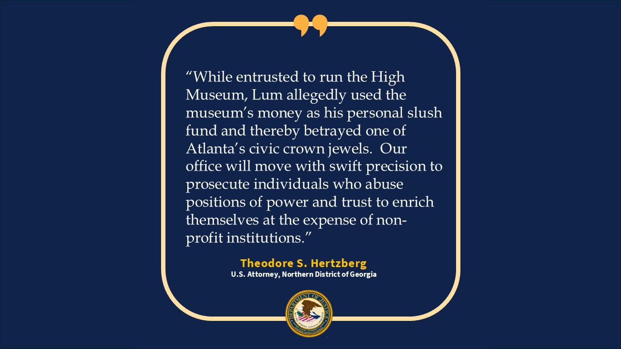 “While entrusted to run the High Museum, Lum allegedly used the museum’s money as his personal slush fund and thereby betrayed one of Atlanta’s civic crown jewels,” said U.S. Attorney Theodore S. Hertzberg. “Our office will move with swift precision to prosecute individuals who abuse positions of power and trust to enrich themselves at the expense of non-profit institutions.”