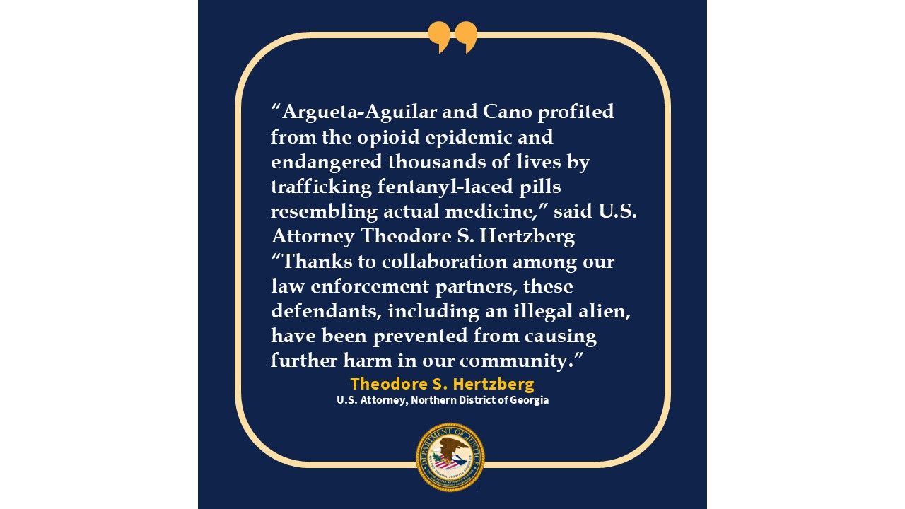According to U.S. Attorney Hertzberg, the charges, and other information presented in court: In February 2024, federal agents began investigating Argueta-Aguilar, an illegal alien who was living in Norcross, Georgia, for receiving mail parcels containing counterfeit pills with the imprint M30, which is a common imprint on legitimate oxycodone tablets. On March 19, 2024, federal agents intercepted a package Cano shipped to Argueta-Aguilar from Arizona. The package contained more than 125 grams of fentanyl-laced blue M30 pills in a vacuum-sealed plastic baggie.