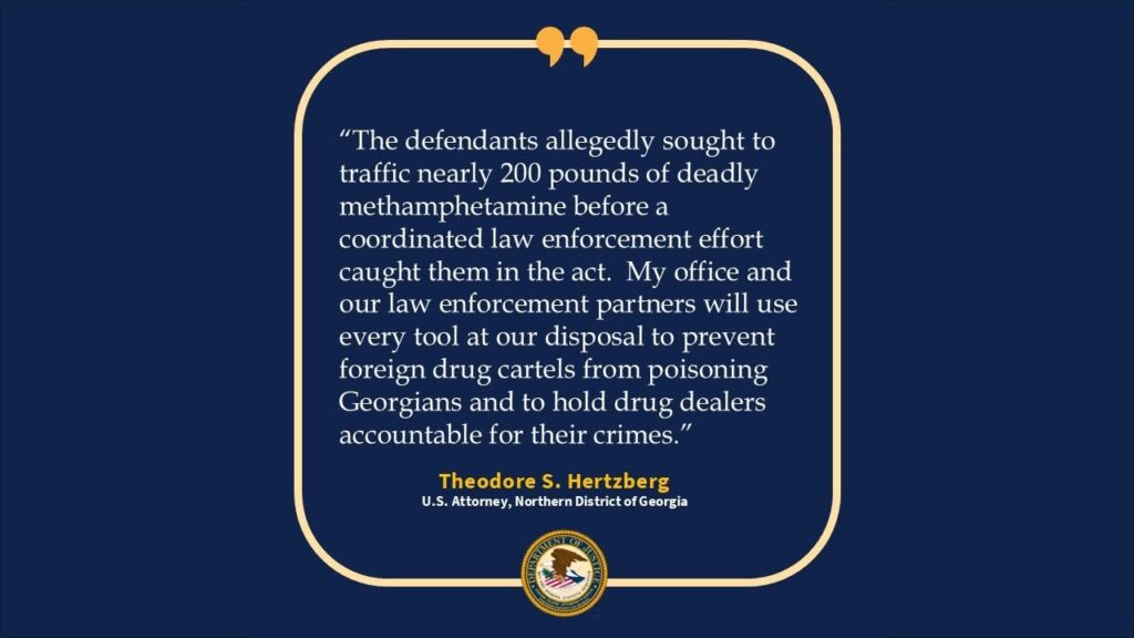 “The defendants allegedly sought to traffic nearly 200 pounds of deadly methamphetamine before a coordinated law enforcement effort caught them in the act,” said U.S. Attorney Theodore S. Hertzberg. “My office and our law enforcement partners will use every tool at our disposal to prevent foreign drug cartels from poisoning Georgians and to hold drug dealers accountable for their crimes.”
