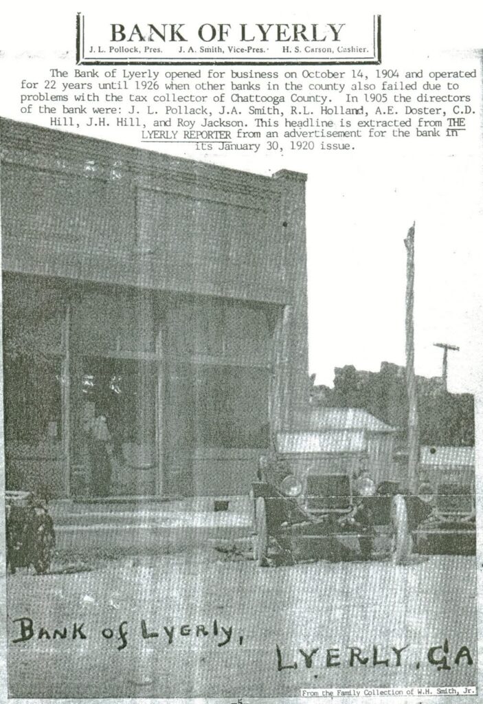 The Bank of Lyerly in 1914 was a wooden two-story building