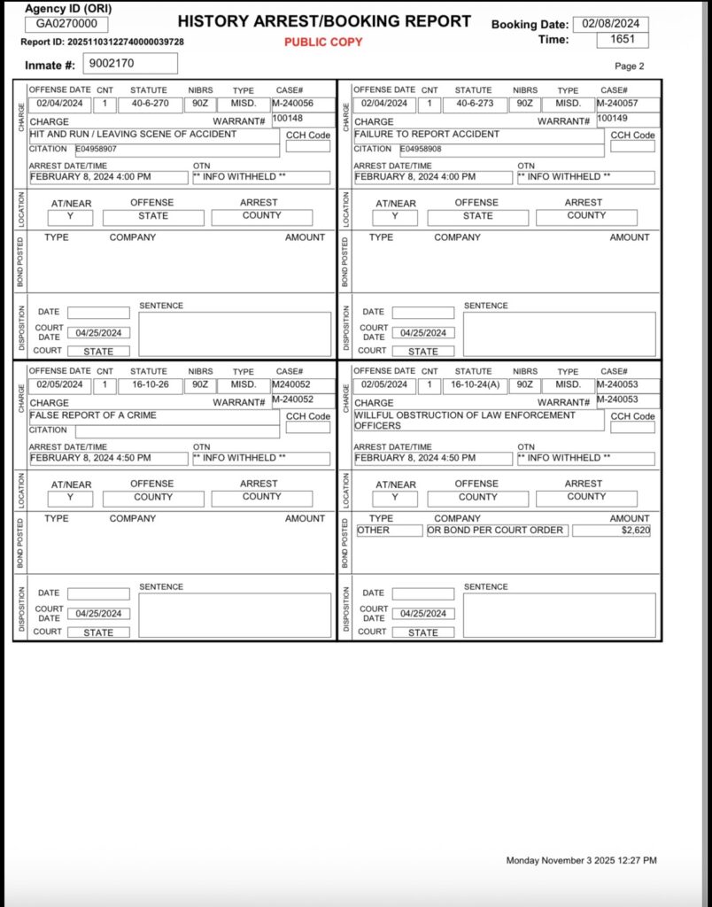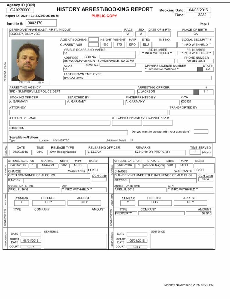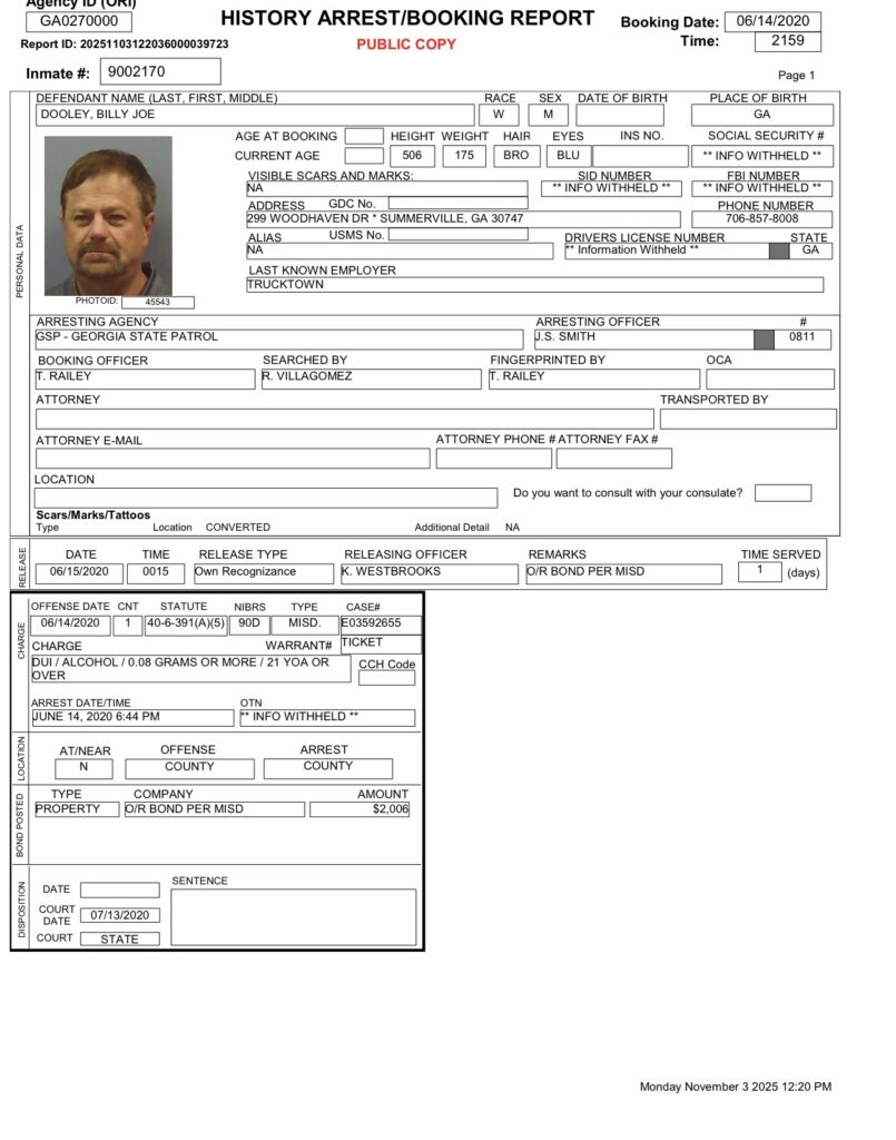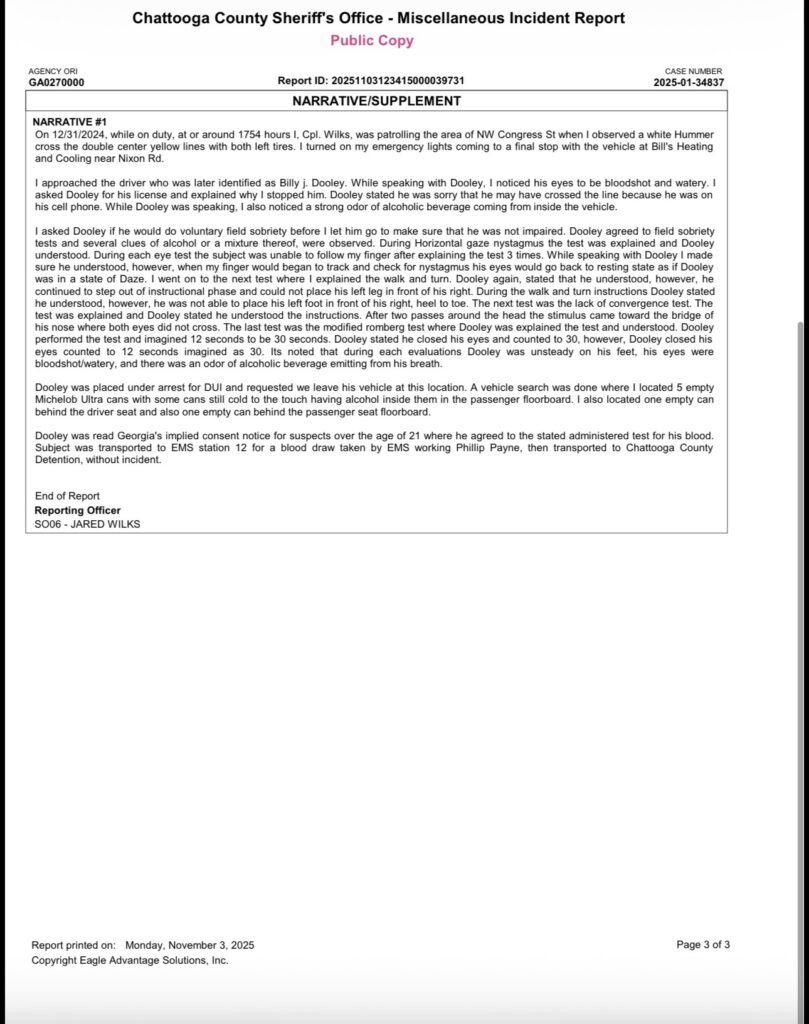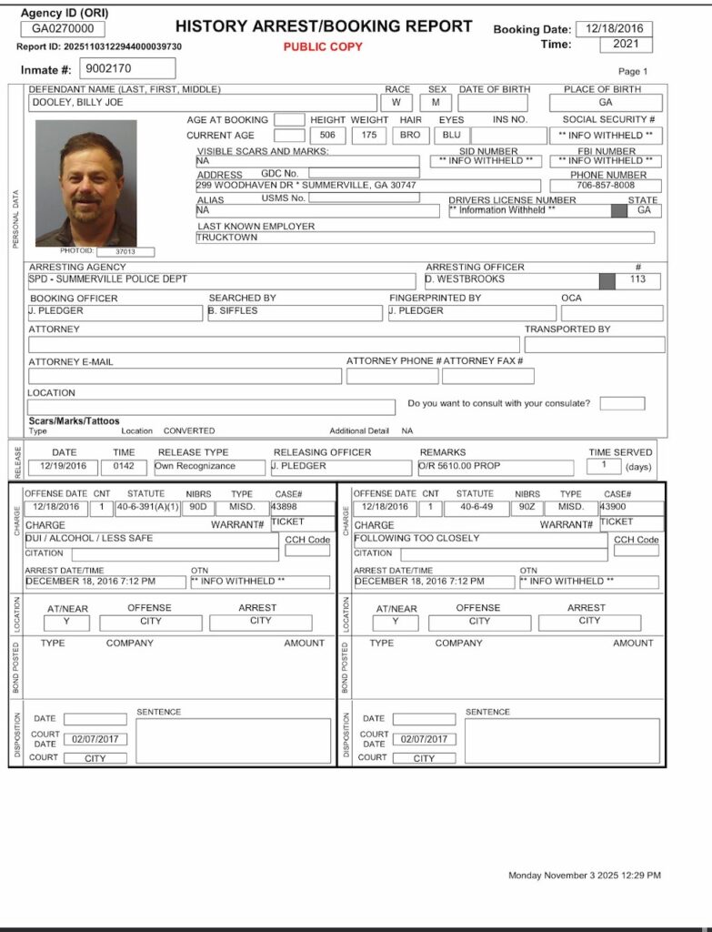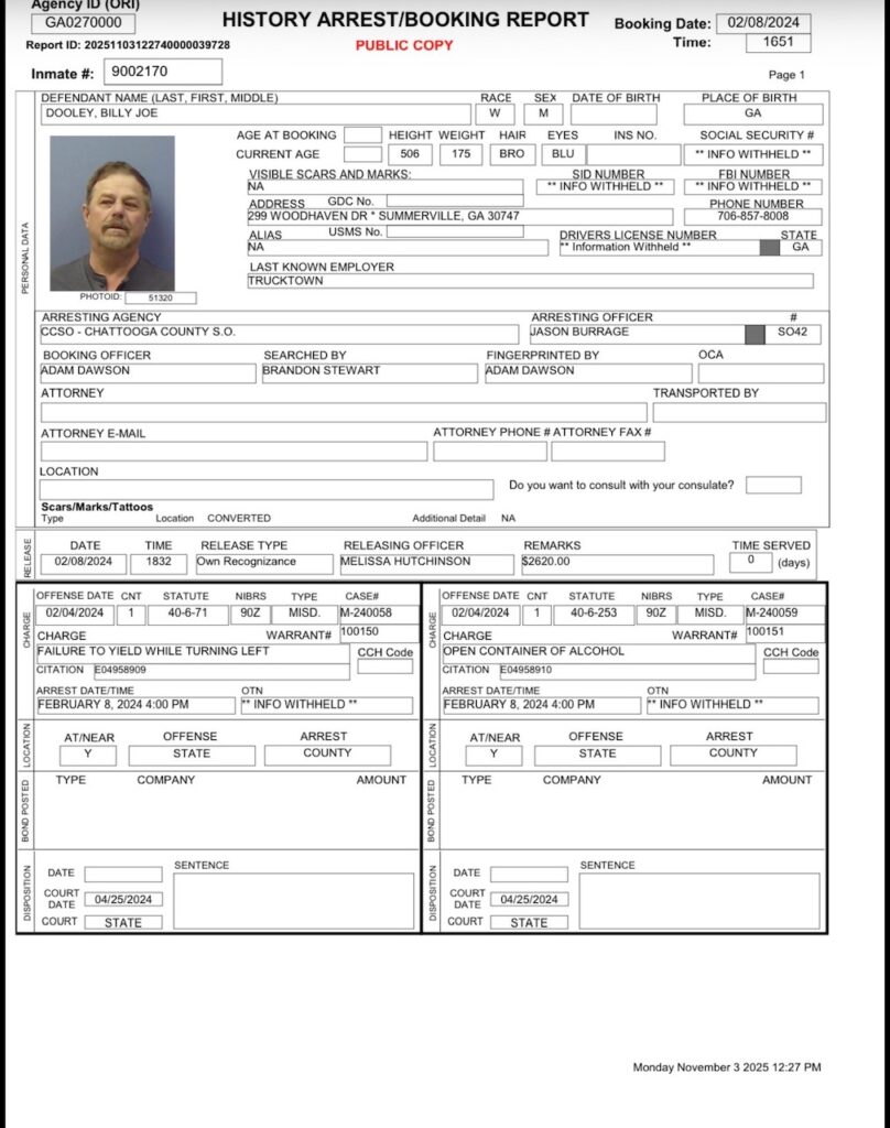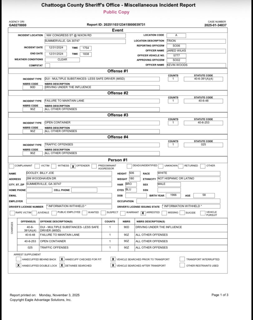 The Chattooga County Sheriff’s Office stated that no citations for DUI or driving without a valid license were found in its records management system. Additionally, officials reported they found no records indicating that Dooley’s driver’s license had been suspended, revoked, or otherwise restricted in their system.