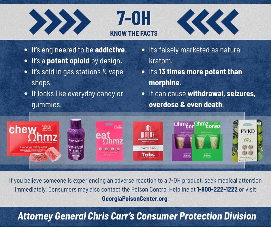 Attorney General Chris Carr is warning Georgians about the dangers of products containing 7-OH, an opioid-like substance that is flooding gas stations, vape shops, and convenience stores.