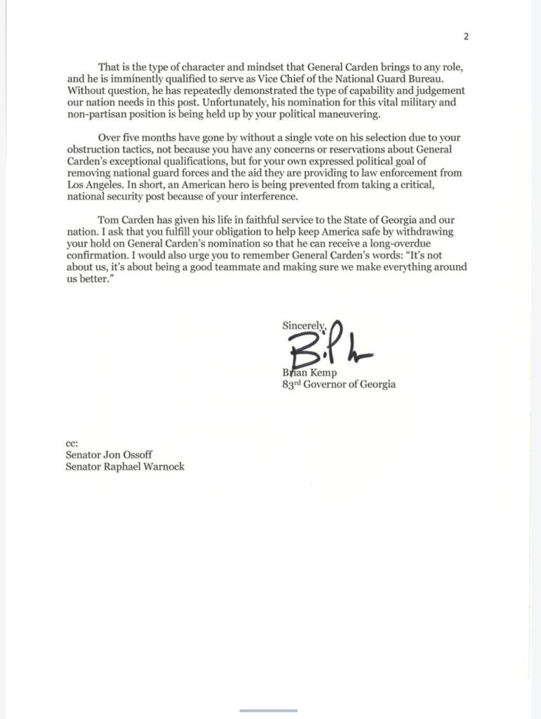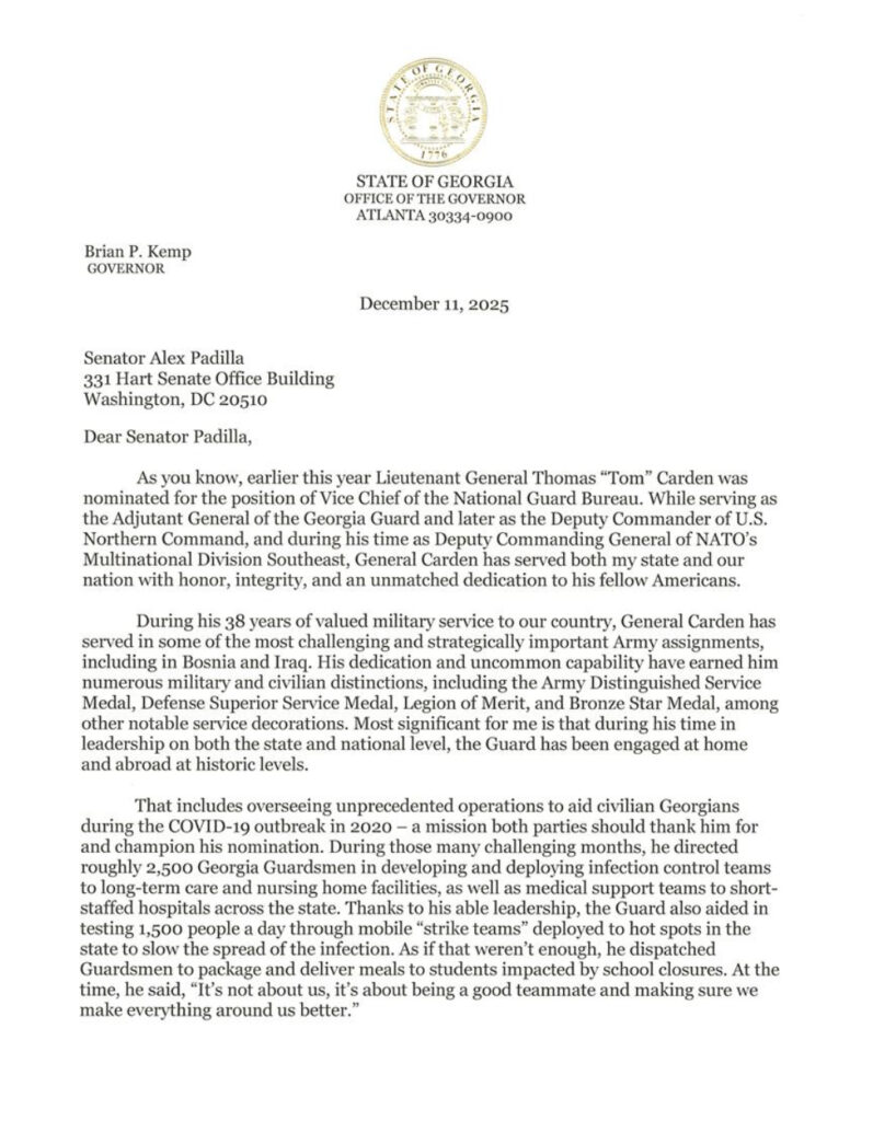 “During his 38 years of valued military service to our country, General Carden has given his life in faithful service to the State of Georgia and our nation, including during the unprecedented challenges of the COVID-19 pandemic,” said Governor Brian Kemp. “So I’m urging Senator Padilla to withdraw his politically-driven hold on the confirmation process and ask all senators to publicly advocate for this American hero and the contributions he’ll make to our national security.”